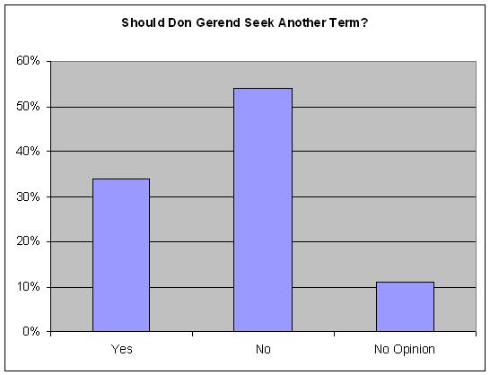 And Don Gerend, who has been a council member since the formation of the City in 1999 and who has told people he intends to run for another term next year (after 14 years in office), should retire, respondents voted. Gerend, Mayor Tom Odell, Deputy Mayor John James and John Curley are up for election next year. Curley said when he was campaigning in 2009 he planned to serve only one term. If he follows through, this guarantees one open seat in the 2013 election.