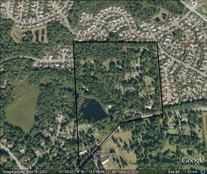 At one time, King County proposed connecting Trossachs Blvd. with Main Street with a road that would have bisected Soaring Eagle Park along where the Pipeline Trail exists today. Ball fields were proposed in the center of the park. These plans were scotched in favor of a passive park. The County and Sammamish did agree to transferring 30 acres (depicted at the bottom of the illustration) to then City for ball fields. None has been adopted yet by the City.