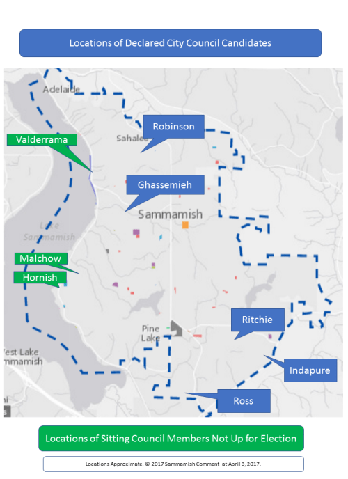 With the five declared candidates and the V-3, the geographic representation is concentrated along Sammamish’s west and Southeast sides. Only Robinson lives elsewhere, near the Sahalee area. (Figure 2.)