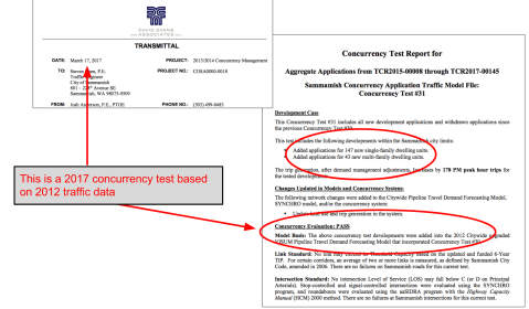 - Sammamish is mostly using traffic counts from 2012 for its concurrency testing, rather than more recent counts.