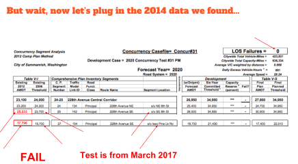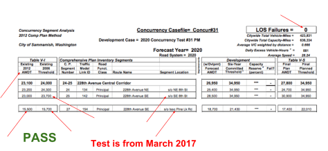 - Traffic on sections of 228th and Issaquah-Pine Lake Road fail under more recent counts than the 2012 numbers used. Projects tested for concurrency would have failed with the more recent traffic numbers.