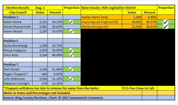 In Position 3, it’s a tight race between Karen Moran, Karen Howe and Minal Ghassemieh. But based on historical voting patterns in which the election night results differ only 1% to 2% in the final results, Sammamish Comment projects that Howe and Moran will likely advance to the general election in November. We expect this vote to tighten during the next two weeks. Votes are certified Aug. 15.