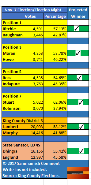 Historically, election night results vary only a point or two from certified results. The margins are wide enough in every race to enable Sammamish Comment to project winners.