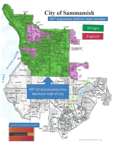 The 45th encompasses the northern half of Sammamish, roughly along SE 8th St. as the dividing line.