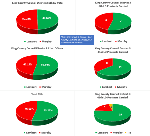 Murphy has little name recognition outside his North Bend base, but he did surprisingly well in Sammamish, winning 19 of 61 precincts and tying in one. The one in which he tied Lambert had one write-in vote, which had it been cast instead would have won the precinct for either Lambert or Murphy.
