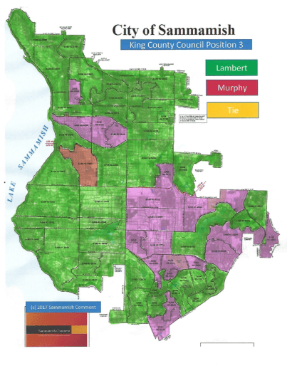 But in Sammamish, Lambert captured only 52.49% of the vote against John Murphy, a Democrat, from North Bend. Lambert is a Republican. The race is non-partisan, but parties lined up behind both candidates.