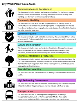 Friday’s biggest topic was the 2018 work plan. Staff worked to break down all the work to fit into eight Focus Areas show in the graphic. Greater detail can be found on these Focus Areas with the hyperlink. As Council went through what its priorities would be for 2018, we designated them by these focus areas. Many of the Council’s priorities and goals fit into multiple buckets.