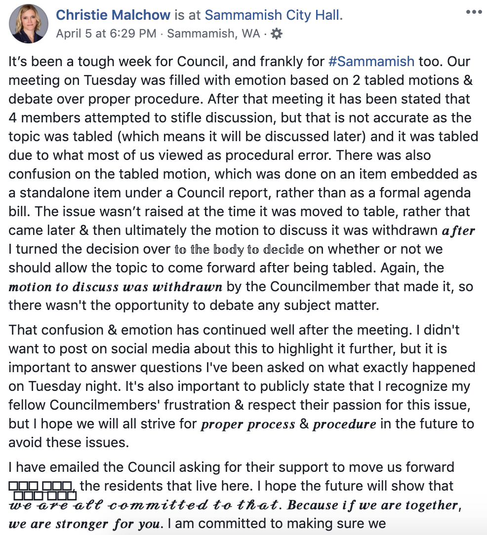 “After that meeting it has been stated that 4 members attempted to stifle discussion, but that is not accurate as the topic was tabled (which means it will be discussed later) and it was tabled due to what most of us viewed as procedural error.