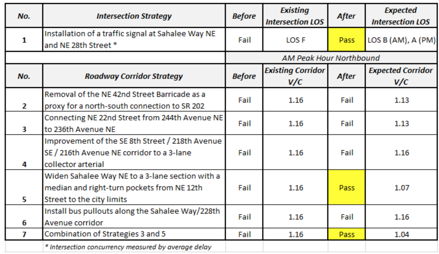 With direction from city staff, the city’s traffic modeler, David Evans and Associates (DEA), tested the effects of seven strategies to improve operations on the failing corridor. The following table illustrates the strategies the City could implement and their impact on the V/C for the failing corridor. Only the AM Peak Hour Northbound is shown because that is when the corridor is most congested.