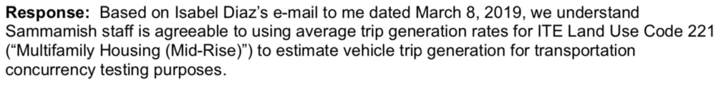 “Based on Isabel Diaz’s e-mail to me dated March 8, 2019, we understand Sammamish staff is agreeable to using average trip generation rates for ITE Land Use Code 221 (“Multifamily Housing (Mid-Rise)”) to estimate vehicle trip generation for transportation concurrency testing purposes.”