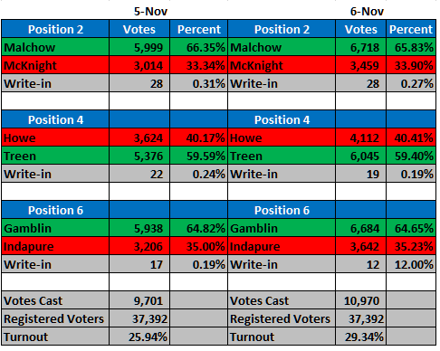 Nov 6 Table Published November 6, 2019 at 486 × 388 in Election Results, Day 2: Malchow, Treen, Gamblin widen vote lead