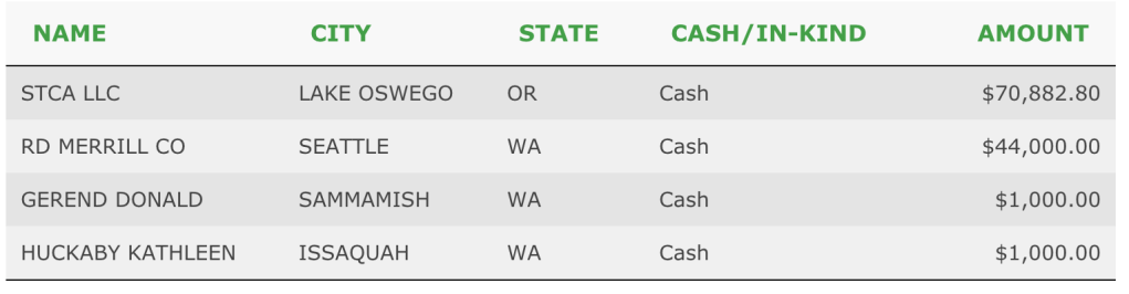 But now, with its $70,882.80 contribution, representing 60% of the total raise, it’s clear that it was indeed STCA and Matt Samwick who have been behind the failed attempt to win a Sammamish City Council majority.