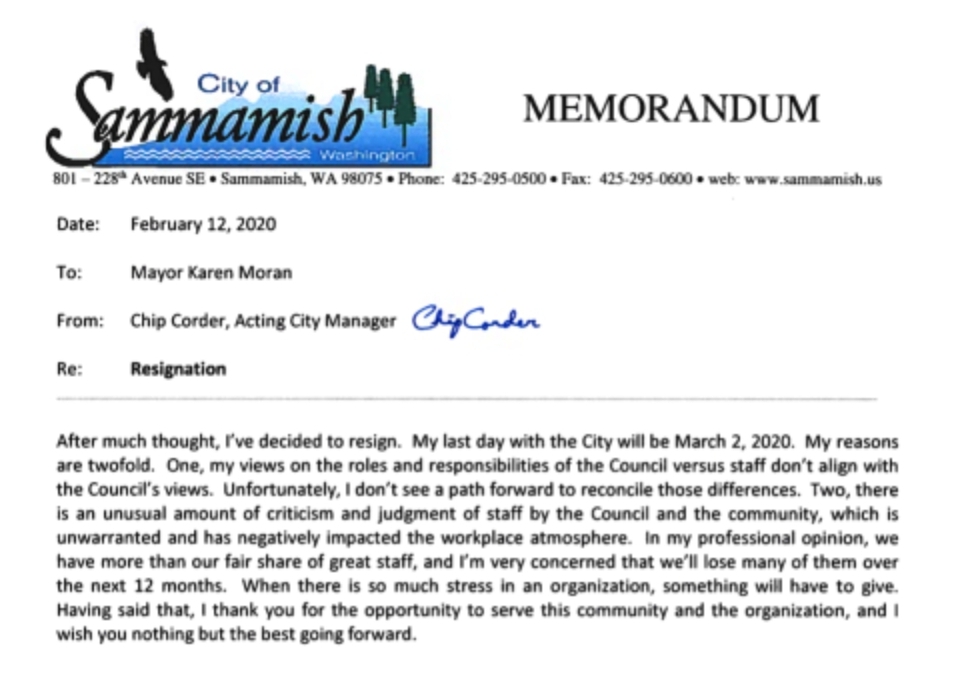 “Being Interim City Manager has been a tough job, and one that was thrust Mr. Corder at a difficult time and under difficult conditions. But, the Council is tasked with making policy to represent the citizens’ wants and needs and Staff is responsible for carrying out that policy. The system just doesn’t work any other way. Staff have had to adjust to policies they may or may not agree with. But in the end WE ALL serve the residents of Sammamish and they have voiced their opinion. We all need to carry that forward.