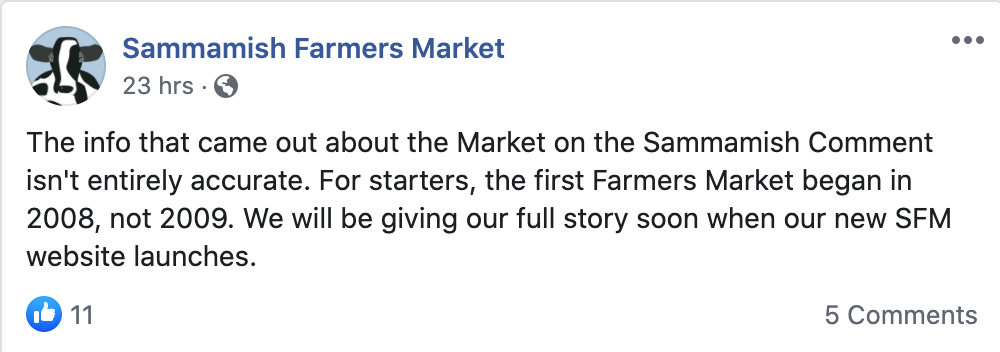 The following day, at 11am, the Chamber announced that the Sammamish Farmers Market will be held starting June 3, contrary to the City Council’s decision. The announcement was made on the Market’s Facebook page and subsequently on its webpage: