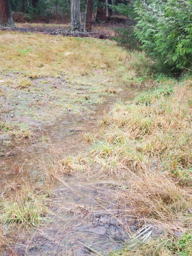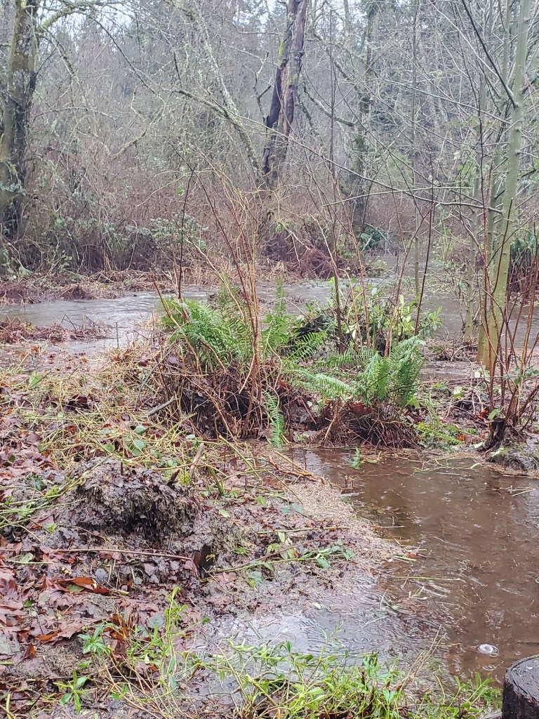 “These photos were taken during a typical rain at (a) 222nd place se at the Lower Commons Park’s parking lot outfall and (b) at Ebright Creek below the 222nd cul de sac, where the outfall ends up.  Given that the Brownstone developments [STCA Town Center Phase 1] at 222nd place se and se 4th – if approved – will (1) denude the landscape of grasses and heritage trees and (2) then pave over approximately +-10 acres and (3) thus significantly increase runoff, the damage to property and the creek will undoubtedly increase commensurately.”