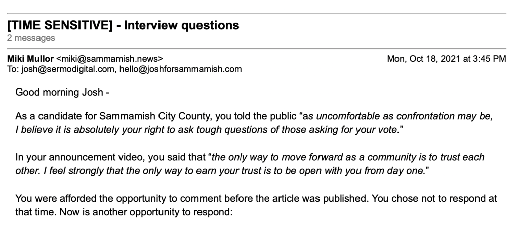 Sammamish City Council Candidate Josh Amato did not respond to tough questions raised regarding the veracity of his candidacy announcement concerning an arrest and a recent attempt to scrub his 2010 ties to a white supremacy hate group.