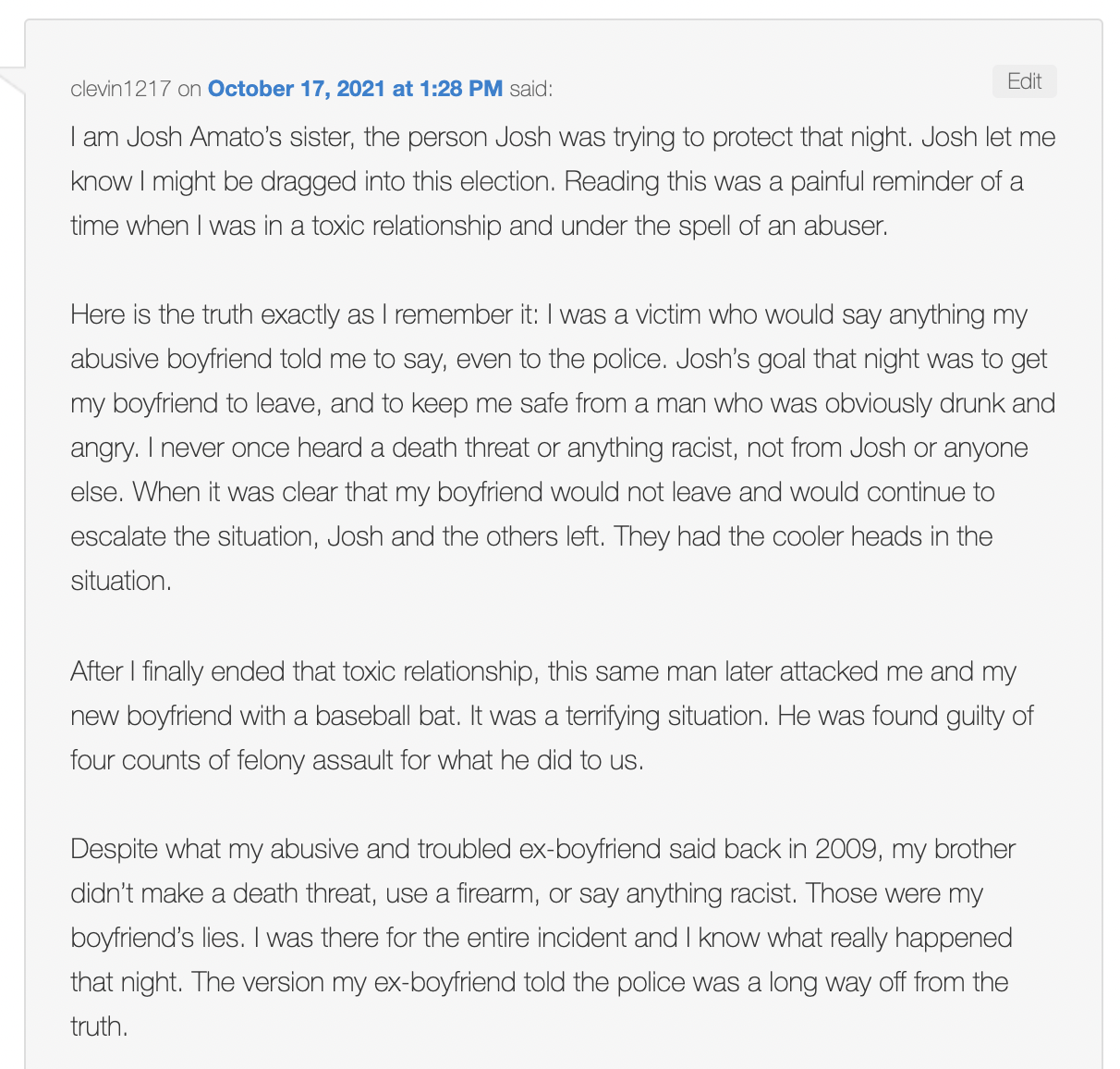 Instead, Amato’s sister posted a comment on our story, largely backing Amato’s version of the events. The sister’s comment, however, leaves many questions open.