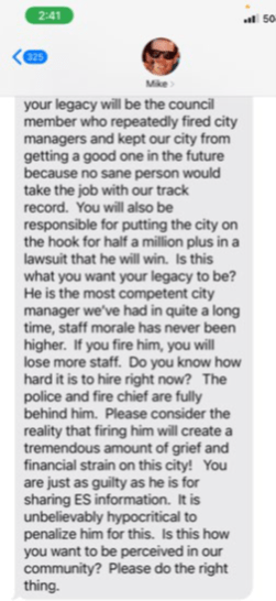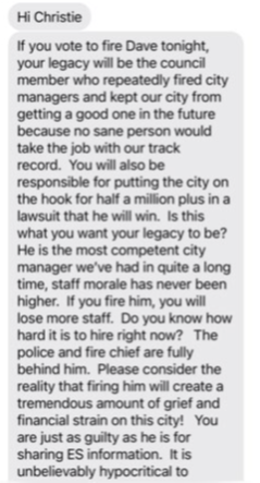 One, from Cheryl Hooper dated November 17, the day after the Council meeting, said, “It has come to my attention that there are some people on this council being manipulated by an outside influence that no longer resides in this city. It has been explained to me that this person has helped certain council members get elected, and as a result is expecting favors – including requiring certain city staff to be fired.