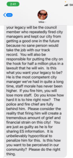 On November 16, in advance of the Council meeting at which a vote was planned to fire Rudat, Scoles texted Malchow with the claim. Scoles repeated the claim again during a scathing public comment at the beginning of the meeting.