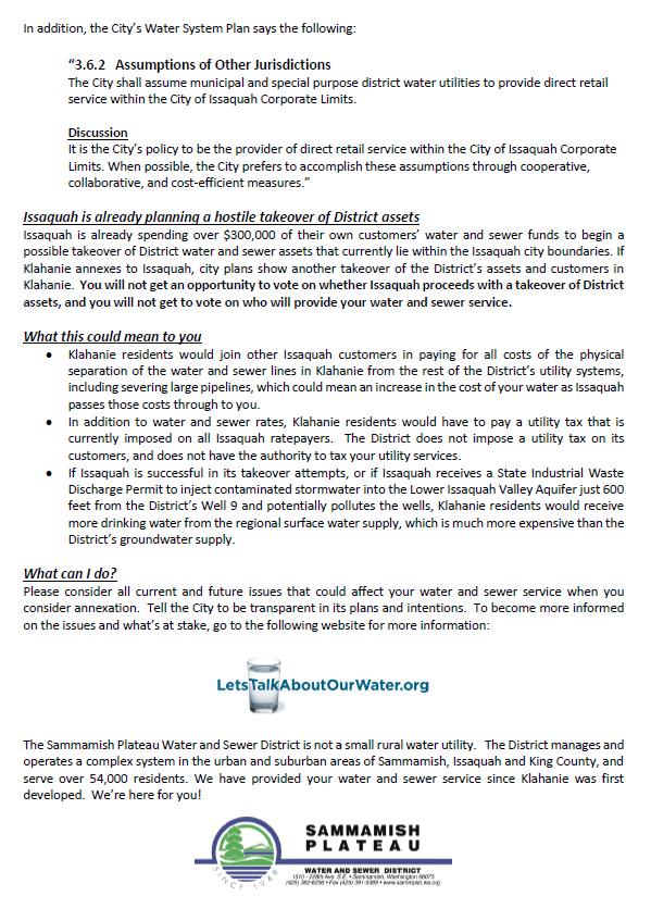 Frisinger has accused the Water District of misleading the public and that “customer confusion” exists within Issaquah over which agency, the City or the District, provides water and sewer service to the small portion of the District that lies within the City limits.